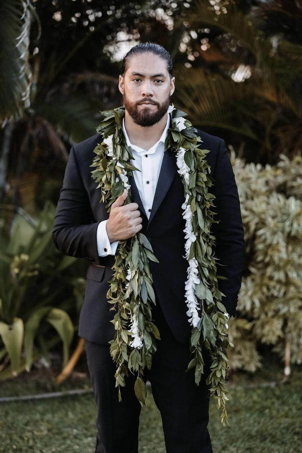 Make a statement with a sleek and modern black suit, worn with an effortless air of casualness. This groom exudes confidence and sophistication in this polished, yet laid back ensemble. No tie, no pocket square, no problem.