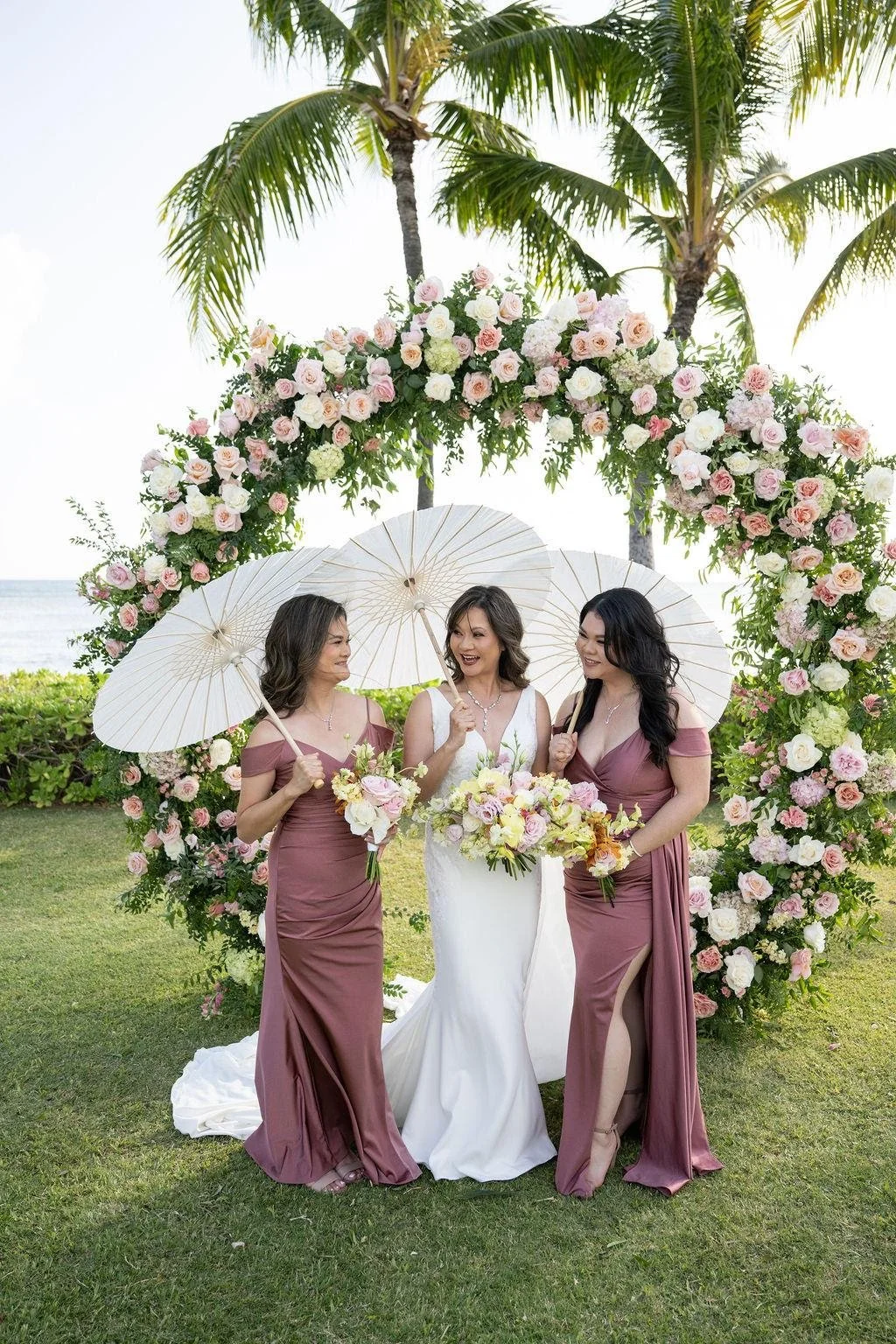 Dresses—who doesn’t look forward to the big reveal? Aside from the bride, the bridesmaids set the vibe the moment the music starts. In Hawaii, color and texture do the magic: ocean-cool palettes, airy fabrics, and florals that dance with the trade winds. Not strict matching, just harmony. When gowns, bouquets, and the setting speak the same language, every photo sings.