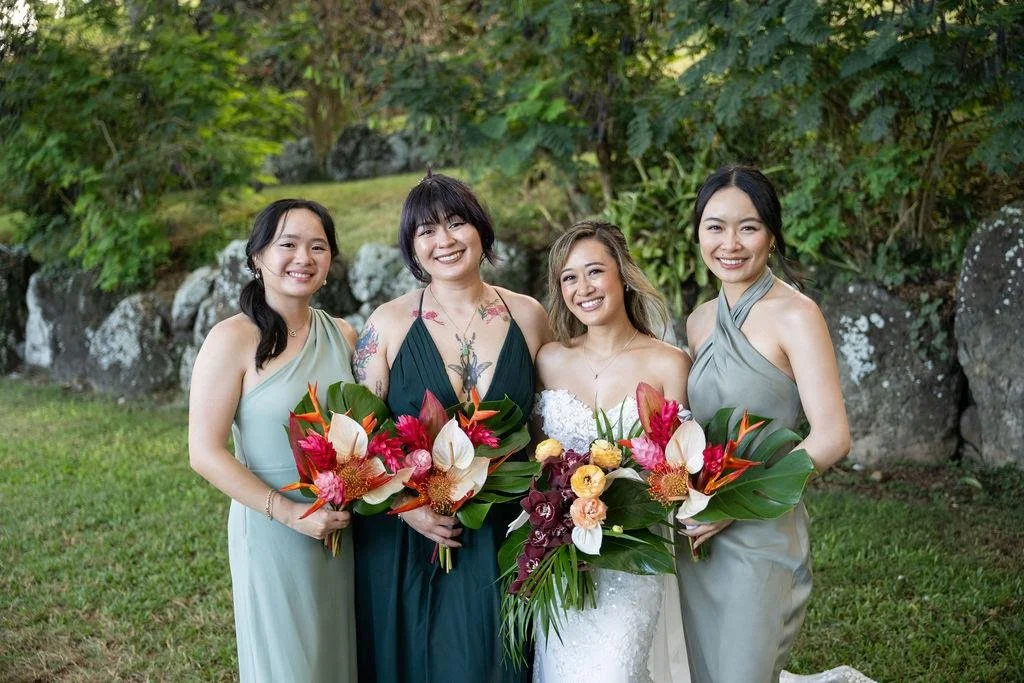 We’ve been swooning over recent weddings across Oʻahu, Maui, and beyond and pulled the standouts. Think sleek black gowns, sunset brights, and soft lilacs, each styled with bouquets and little accessories that make the colors pop. Treat these as your jumping-off point, then tweak the shade, neckline, or hem to fit your crew. Ready to dress the dream team?