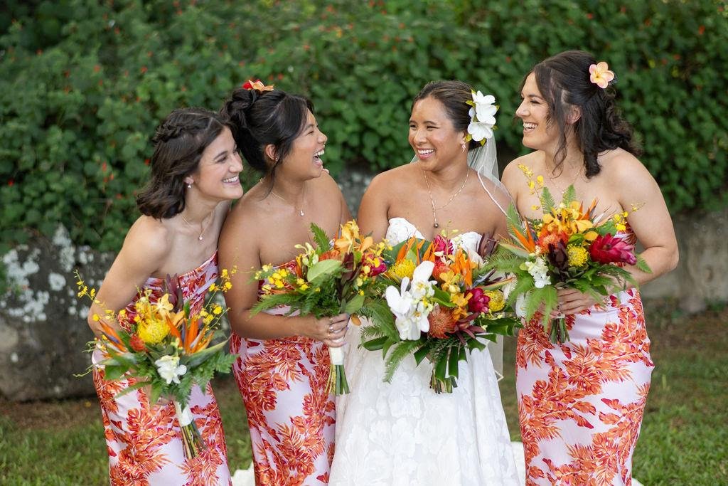 Matching pareo-style prints for the win, fiery orange and coral florals echo the dresses, turning the bridal party into a living lei.