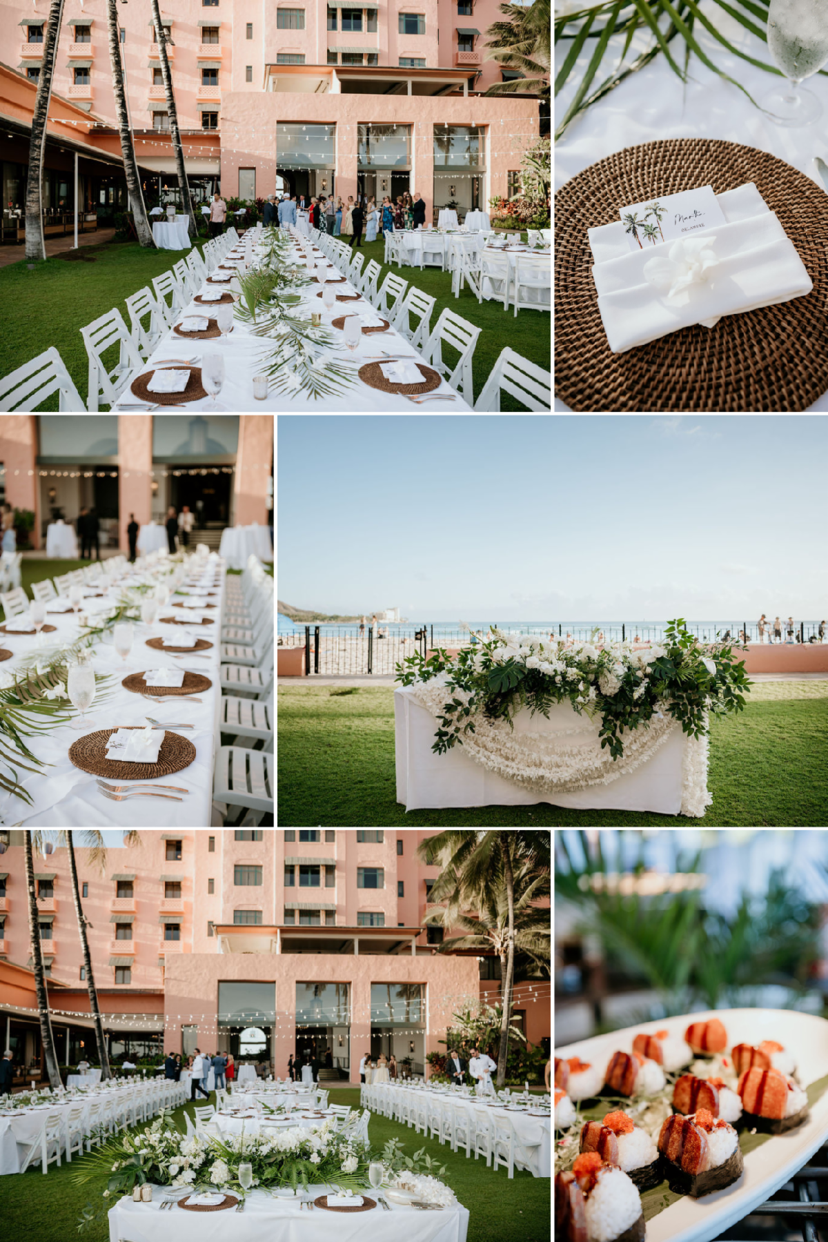 Long lawn tables with palm fronds, woven chargers, and crisp linens, clean, coastal, and effortlessly “Royal Hawaiian.”