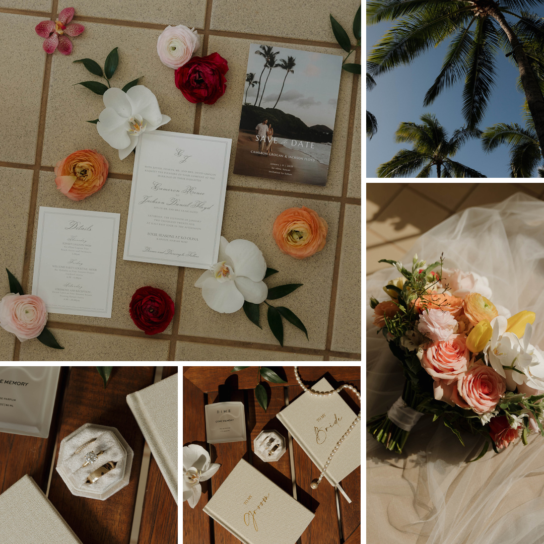 Those stationery details with the bright blooms are giving “classic… but make it island.” Also, the rings look like they’re ready for their close-up.